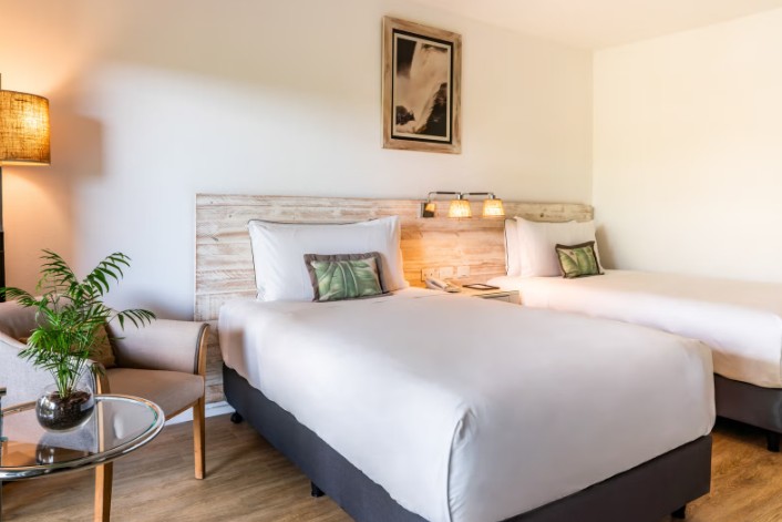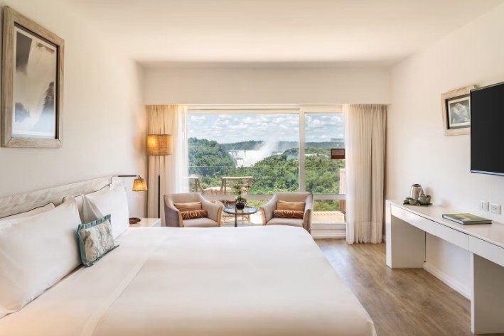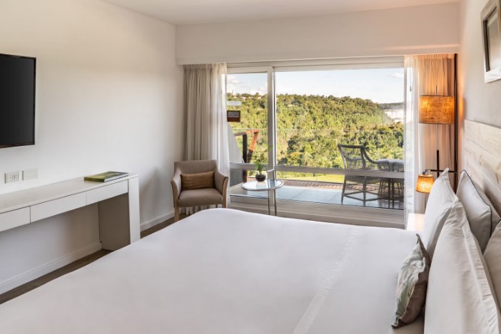Decorados de forma modesta, os quartos do Meliá Iguazu contam com amplas varandas privativas. Alguns dispõem de vista para as cascatas e outros desfrutam de uma vista para a floresta.